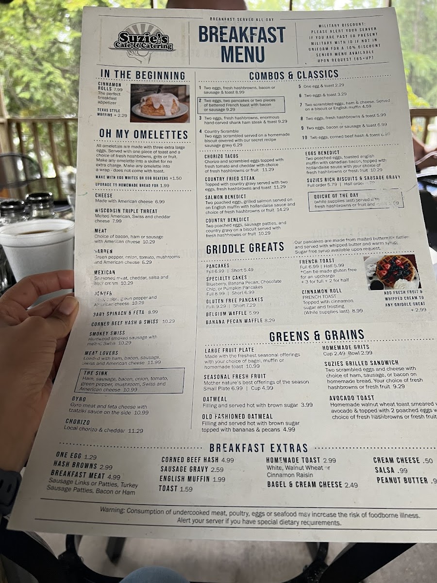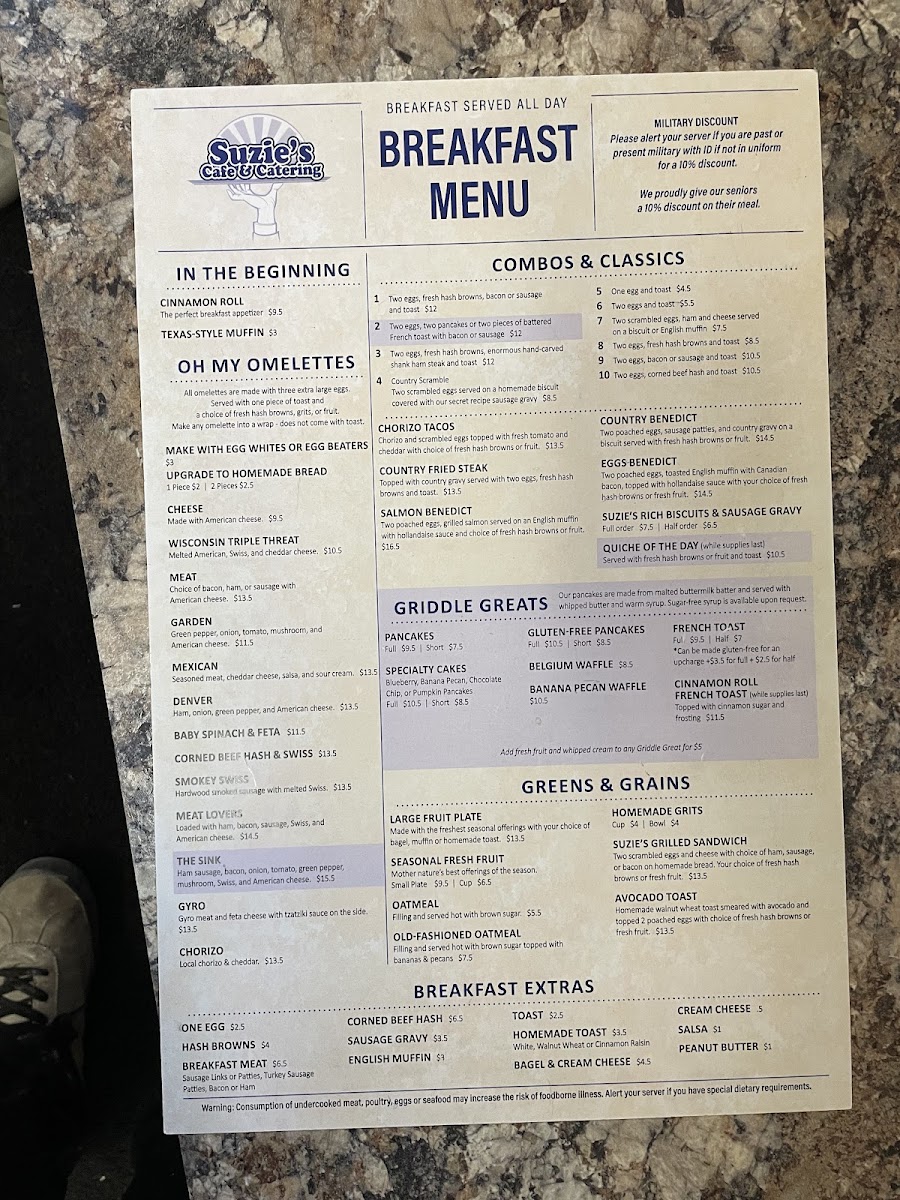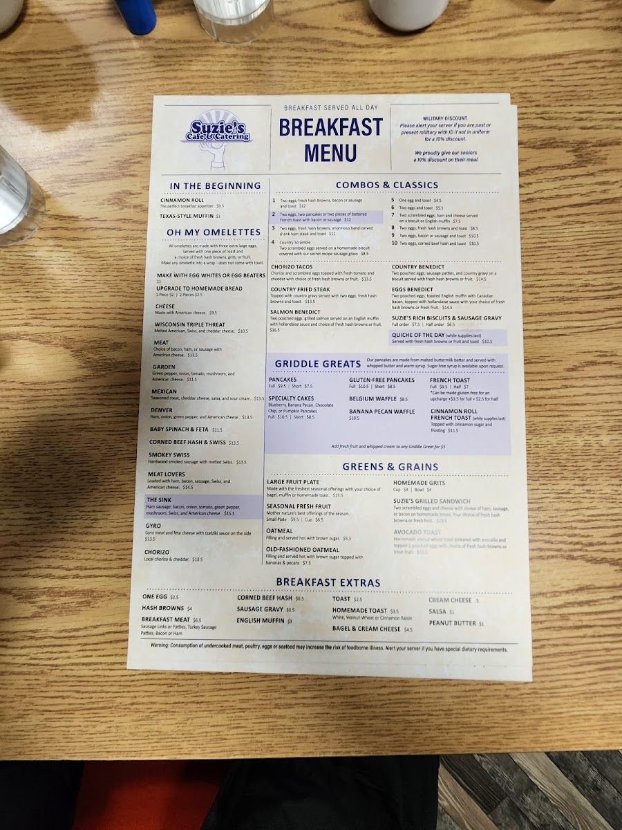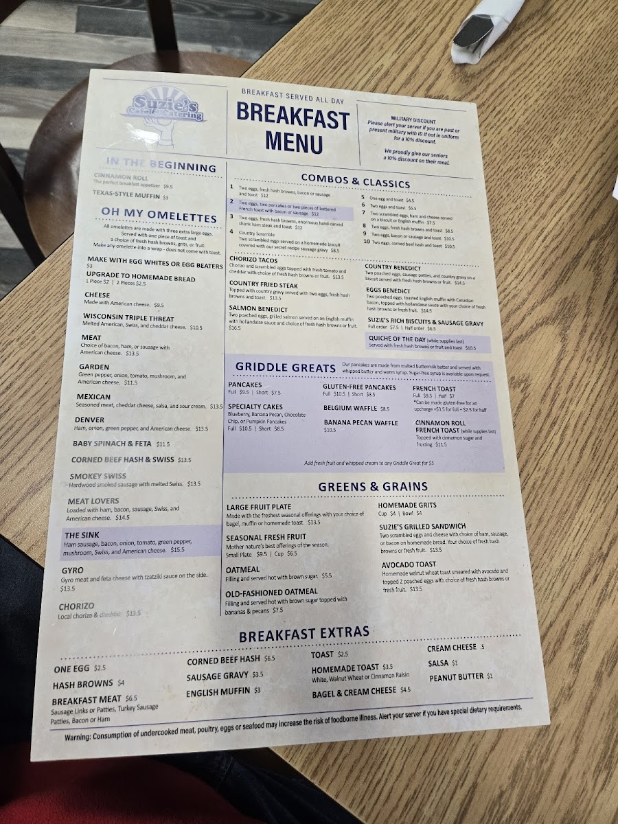 Suzie's Cafe & Catering, located at 1050 Southpoint Cir in Valparaiso, IN, offers a delightful menu that caters to a variety of palates. Their signature offerings include mouth-watering omelettes like the Smokey Swiss and the savory Chorizo Cheese, perfect for a hearty breakfast. The Greens & Grains section features fresh, seasonal fruits and delicious Avocado Toast, appealing to health-conscious diners.